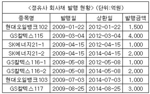 GS칼텍스가 3월(4000억원) 5월(3000억원)에 이어 지난 25일 3000억원의 회사채를 추가로 발행하면서 총 1조원에 달하는 자금을 조달했다. SK에너지는 4월에 3000억원을, 현대오일뱅크는 1월과 7월에 각각 1500억원과 1000억원씩 총 2500억원의 회사채를 발행했다. 다음 달 에쓰오일은 6년 만에 처음으로 4000억원 규모의 회사채를 발행할 계획이다.