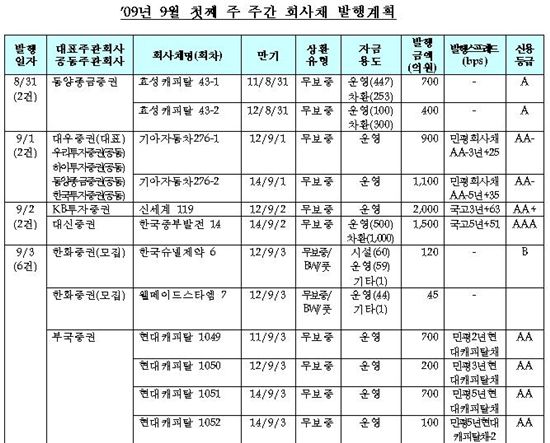 금융투자협회가 28일 발표한 ‘2009년 9월첫째주(8월31일~9월4일) 회사채 발행계획’ 집계결과에 따르면 KB투자증권이 주관하는 신세계 119회차 2000억원을 비롯해 총 16건 1조1525억원의 회사채가 발행될 예정이다. 이는 이번주(8월24~28일) 발행계획인 41건 1조6850억원에 비해, 발행건수와 금액별로 각각 25건 5325억원이 감소한 것이다.