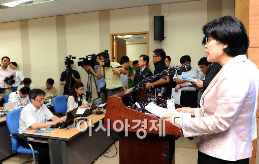 전재희 보건복지부 장관이 28일 서울 계동 보건복지부에서 신종플루 예방 백신 확보 현황과 치료 거점병원 등에 대해 브리핑을 하고 있다.
