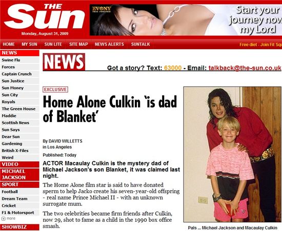지난달 31일(현지시간) 영국 타블로이드 신문 '더 선'에 따르면 잭슨은 컬킨으로부터 기증 받은 정자로 애칭 '블랭킷'으로 불리는 프린스 마이클 2세를 낳았다는 것이다.