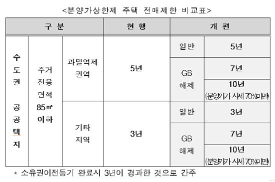 그린벨트를 해제해 조성된 공공택지에서 공급하는 보금자리주택의 경우 전매제한기간을 현행 5년에서 7~10년으로 강화한 것이다. 10년 전매제한은 분양가가 인근지역 주택매매가격의 70% 미만인 경우다.