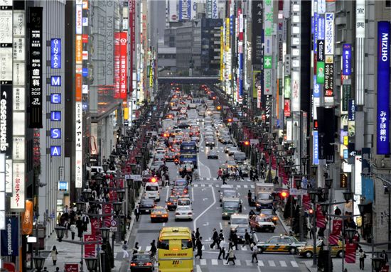 1일 부동산 중개업체 CB 리처드 엘리스 그룹에 따르면 8월 중순 기준으로 도쿄의 대표적 상업지구인 긴자의 1평방피트당 임대료는 10만∼23만 엔으로 지난해 같은 기간에 비해 11% 떨어진 것으로 나타났다. 임대료가 가장 비싼 지역 중 하나인 오모테산도 역시 8만∼20만 엔으로 작년에 비해 하락한 것으로 집계됐다.