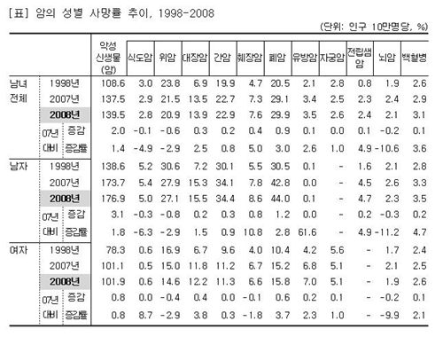 또 남자의 경우 인구 10만명당 폐암 44.0명, 간암 34.4명, 위암 27.1명의 순으로 사망률이 높았고, 여자는 폐암 15.8명, 위암 14.6명, 대장암 12.2명 등의 순이었다.