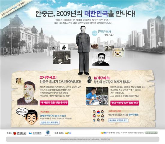 안중근 의사가 탄생한 9월 2일을 시작으로 9월 30일까지 '안중근, 2009년의 대한민국을 만나다'라는 온라인 이벤트(http://an100years.korea.kr)를 통해 국민의 얼굴 이미지를 모아 안중근 의사의 얼굴 형상을 완성하는 '모아주세요!, 안중근 의사가 다시 태어납니다'를 진행한다.