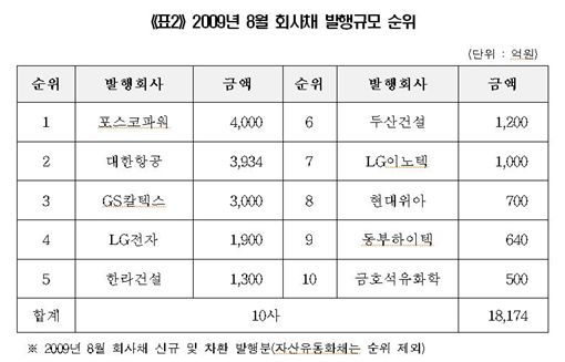 회사 별로는 포스코파워가 4000억원으로 가장 큰 규모의 회사채를 발행했고 대한항공(3934억원), GS칼텍스(3000억원), LG전자(1900억원)도 대규모로 회사채를 발행했다.
