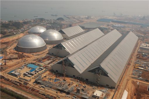 반면 현대제철은 제철원료를 전량 옥내에 보관한다는 발상의 전환을 통해 철광석을 저장하게 될 원형 원료저장고 5동과 철광석, 유연탄, 부원료 등을 저장하게 될 선형 원료저장고 4동 등 총 9동의 밀폐형 원료처리시설을 세계 최초로 일관제철소에 적용했다. 현재는 원형설비 3동과 선형설비 4동의 건설이 거의 마무리된 상태다.
