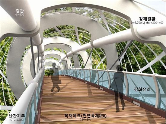 또 수직재는 각각의 기울기를 가진 원환(내경 약 5.8m 외경 7.8m)형태를 적용함으로써 보도교 전체가 조형미를 갖춘 부드럽고 친근한 이미지를 살릴 수 있도록 제작함으로써 트러스 구조의 새로운 면모를 보여주게 된다.