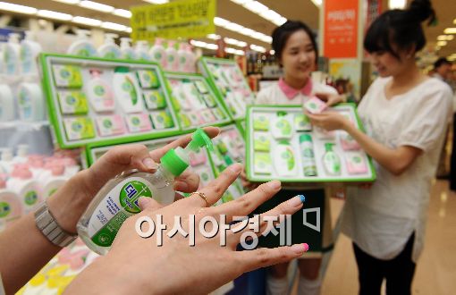 신종플루 예방 차원으로 깨끗한 손씻기가 중요해진 가운데 롯데마트가 3일 서울역점에서 손소독제, 손세정제 등 개인위생용품으로 구성된 추석선물세트인 '데톨 세트'를 선보여 고객들의 눈길을 끌고 있다.