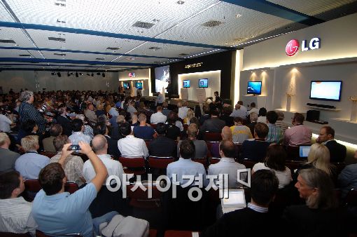 3일(현지시간) LG전자는 독일 베를린에서 열리는 'IFA 2009' 개막을 하루 앞두고 전시장 인근 메세 베를린에서 HE글로벌 컨퍼런스(HE Global conference)를 개최했다. 사진은 외신기자 500여 명이 참석한 가운데 HE사업본부장 강신익 사장이 IFA 대표작 보더리스 LCD TV를 설명하고 있는 모습.
