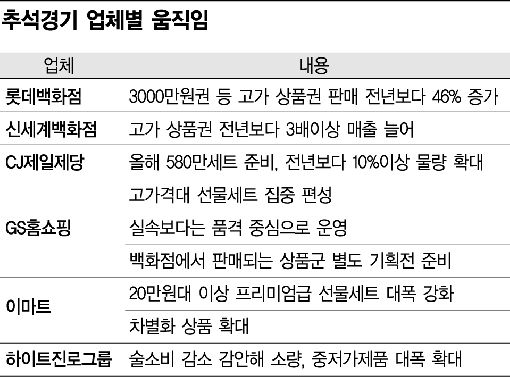 신세계백화점도 올 추석에 처음 도입한 3000만원 상품권 세트를 벌써 5세트 팔았고, 1000만원짜리 세트는 50개 이상 판매해 지난해 같은 시점에 비해 3배 이상의 실적을 올렸다.