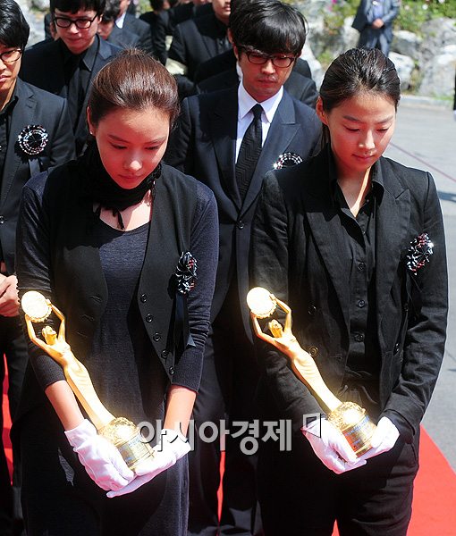 [아시아경제신문 이기범 기자]배우 김아중과 한지혜가 4일 오후 경기도 광주 스카이캐슬추모공원에서 故 장진영의 유골함이 안치되기 전 진행된 추모식에 고인의 트로피를 들고 입장하고 있다.