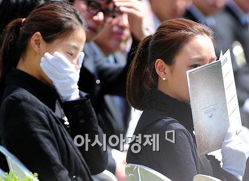 [아시아경제신문 광주(경기)=이기범 기자]4일 오후 경기도 광주시 오포읍 분당 스카이캐슬추모공원에서 故 장진영의 유골함이 안치되기 전 진행된 추모식에서 배우 한지혜와 김아중이 고인의 생전 영상이 담긴 화면을 보고 있다.
