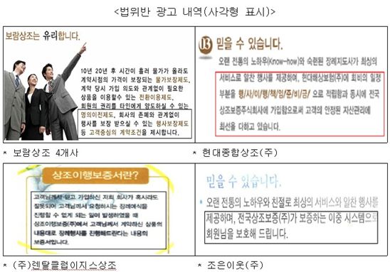 공정위에 따르면 보람상조 4개사와 현대종합상조, 렌탈클럽이지스상조, 조은이웃 등 7개 상조업체들은 상조보증회사에 적립한 금액의 한도 내에서 상조서비스 제공 등이 보장됨에도 불구하고 자사의 존폐와 관계없이 서비스를 보장하는 것처럼 광고했다.