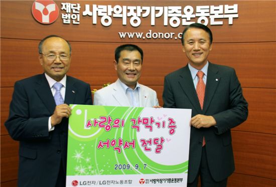 기증식은 지난 7일 박준수 LG전자 노조위원장, 지원부문장 김영기 부사장, 사랑의장기기증운동본부 박진탁 본부장 등이 참석한 가운데 서울 충정로 운동본부 사무실에서 열렸다.