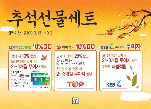 세븐일레븐도 오는 10월6일까지 특산물과 1만원대의 생활용품세트, 백화점 상품과 동일한 품질의 정육 세트, 다양한 종류의 전자 제품 등 예년에 비해 선택의 폭을 다양화 한 총 300여 개 선물을 준비했다.