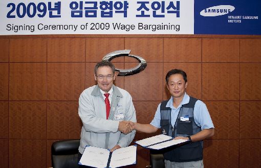 $pos="C";$title="르노삼성";$txt="";$size="510,329,0";$no="200909081012486358596A_1.jpg";@include $libDir . "/image_check.php";?>장 마리 위르띠제 사장(좌)과 신희철 사원대표위원회 위원장(우)이 8일 부산공장에서 진행된 임금협약 조인식을 마치고 악수를 나누고 있다. 이번 임금협상으로 르노삼성자동차는 2000년 출범 이후 9년 연속 무 분규 임금협상을 타결했다.