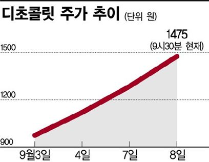 코스닥 상장사 디초콜릿이 주요주주였던 개그맨 신동엽씨가 지난 3일 돌연 경영권에 참여하겠다는 발표에 4일 연속 상한가를 기록 중이다. 지난 2일 850원에 마감됐던 디초콜릿은 8일 오전장 내내 1475원까지 치솟았다.