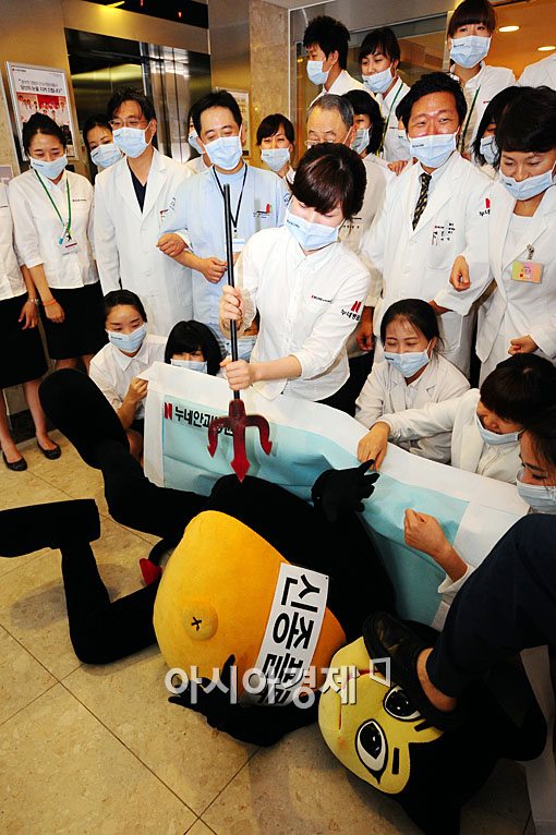 8일 서울 강남구 대치동 누네안과병원에서 직권들이 신종플루 병원균을 물리치는 퍼포먼스를 하고 있다.