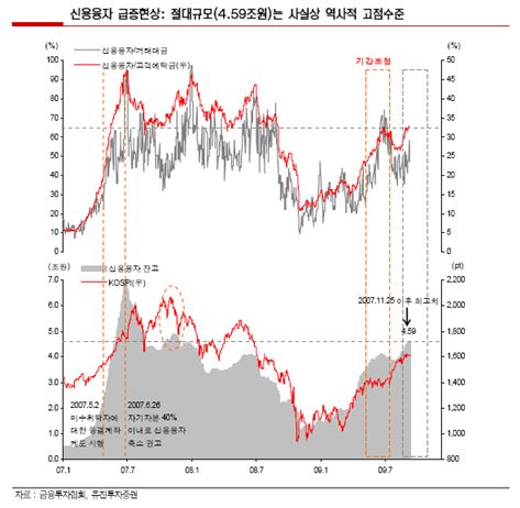 신용융자가 날로 치솟고 있다는 점도 부담이다. 유진투자증권에 따르면, 지난 7일 기준 유가증권시장과 코스닥 시장의 신용융자 합계 수치는 4조5900억원을 기록, 2007년 11월25일 이후 최고치를 기록했다. 2007년 5~8월의 비정상적인 신용급증 국면을 제외하면 사실상 역사적 고점 수준이다.