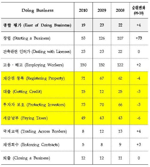 9일 기획재정부에 따르면, 세계은행 산하 국제금융공사(IFC)가 전 세계 183개국을 대상으로 창업, 건축 관련 인허가, 고용.해고, 재산권 등록, 자금조달, 투자자 보호, 세금 납부, 국제교역, 채권 회수, 퇴출 등 10개 지표별로 기업 활동에 대한 규제 정도를 분석·평가한 결과 우리나라는 조사 대상국 가운데 19위를 차지하며 평가가 시작된 지난 2003년 이후 처음으로 10위권대에 진입했다.