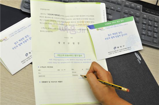 구는 8월 말 '구민고객 민원서비스 평가 엽서' 4000매를 제작, 구청에서 민원업무를 본 민원인을 무작위로 선정해 우편으로 발송했다.