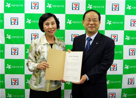 세븐일레븐을 운영하는 코리아세븐의 주우환 대표와 손숙 아름다운 가게 공동대표는 14일 오후 세븐일레븐 본사에서 아름다운 커피 판매 금액 일부를 기부하는 공정무역 지지기업 협약식을 가졌다.