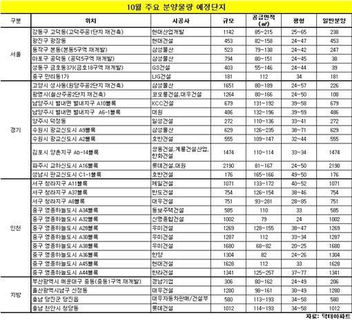 부동산정보업체 닥터아파트에 따르면 보금자리주택 공급물량을 제외한 오는 10월 전국 분양예정(주상복합포함) 아파트는 총 61곳 4만161가구로 조사됐다.