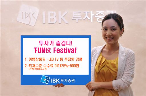 IBK투자증권(사장 이형승)이 오는 11월 20일까지 은행 고객 대상으로 저렴한 수수료와 푸짐한 경품을 즐길 수 있는 'FUN投 Festival'을 실시한다고 16일 밝혔다.