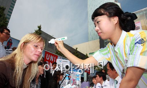 16일 삼성동 코엑스몰 밀레니엄광장을 찾은 내외국인 방문객들이 '신종플루A 예방상담센터'에서 체온을 측정하고 전문가 상담을 통해 예방법에 대해 배우고 있다.