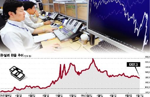 1200원이라는 레벨에 대한 부담감과 당국의 스무딩오퍼레이션이 환율 급락에 제동을 걸고 있다. 외환시장 일각에서는 1200원선 붕괴가 오버슈팅일 것이라는 지적마저 하고 있다.