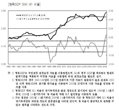그러나 그는 “지난 2007년 하반기 이후 장기추세선을 밑돌던 명목 국내총생산(GDP) 대비 M1 비율이 최근엔 2002년경 가계신용 버블이 형성됐던 시기의 초기단계와 비슷한 정도로 장기추세선을 웃돌고 있는 점 등을 비춰볼 때 명목GDP 대비 M1 비율이 계속 높아지면 자산시장이 과열될 가능성을 배제하기 어렵다”면서 특히 “과거의 자산시장 버블 경험은 ‘위기’ 이후 경기회복기에 확장적인 통화정책이 지속될 경우 심대한 부작용이 초래될 가능성이 높아진다는 점을 시사한다”고 강조했다.