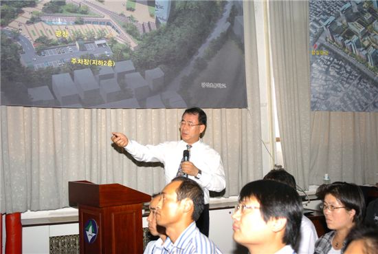 구청 직원들과 광진구 시설관리공단 직원들을 대상으로 광진비전에 대한 정송학 광진 구청장의 강의가 진행됐다.