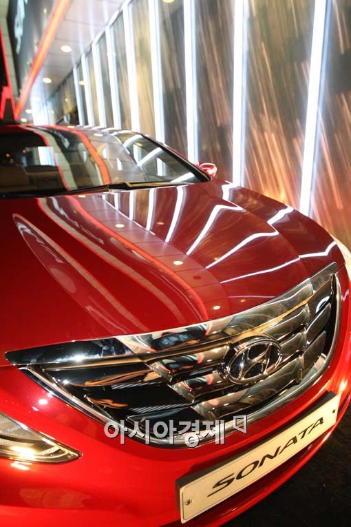 현대자동차는 17일 오후 서울 서초구 한강시민공원 반포지구에 위치한 선상카페에 빨간색상의 신형 'YF 쏘나타'가 전시되고 있다.