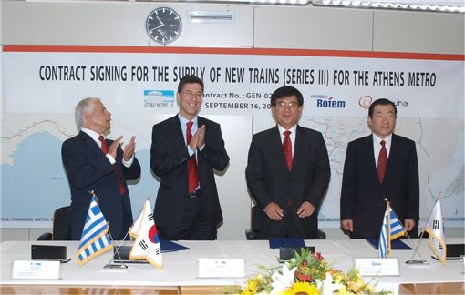 $pos="C";$title="";$txt="(왼쪽에서 두번째부터)야니스 그리스 아테네 지하철 공사 회장, 이여성 현대로템 부회장, 양태진 (주)한화 사장이 지하철 2, 3호선 구간에 운항될 전동차 구매 계약서에 서명한 후 기념 촬영을 하고 있다.