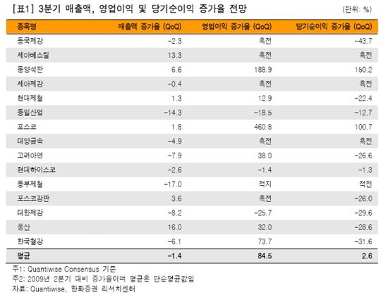 정영권 애널리스트는 "철강 및 비철금속 업종의 3분기 실적전망에 따르면 매출액은 2분기 대비 감소하는 업체가 많고, 영업이익은 대폭 개선되는 업체가 많은 '내실 다지기' 형태가 될 것"이라고 말했다.