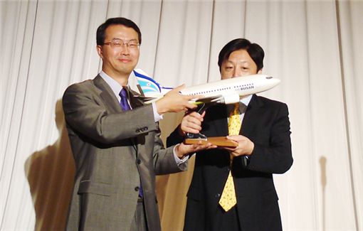 지난 19일 2009 부산~후쿠오카 우정의 해 기념 행사의 일환으로 후쿠오카 선팰리스 호텔에서 열린 오찬 행사에서 에어부산 김수천 대표(사진 왼쪽)가 후쿠오카 시장 요시다 히로시(오른쪽)에게 에어부산 항공기 모형을 전달하고 있다.