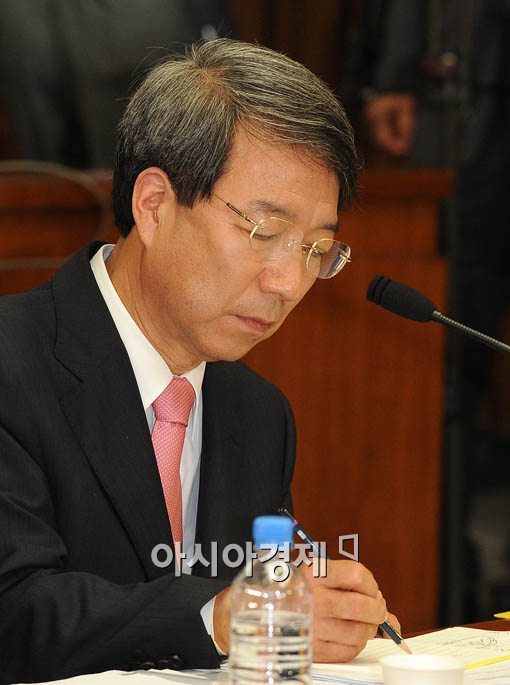 정운찬 국무총리 후보자가 21일 국회에서 열린 인사청문회에서 답변을 하기전 생각을 정리하고 있다.