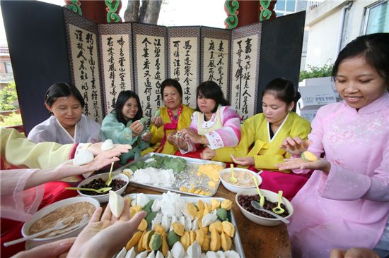 베트남 캄보디아 인도 필리핀 등 결혼이주여성 30명은 이 날 한복을 곱게 차려 입은 채 행사에 참여해 2주 앞으로 다가온 추석 명절 분위기도 느낄 수 있었다.
