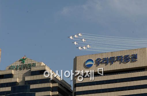 공군은 22일 오후 서울 여의도 공원에서 열린 ‘공군 창군 60주년 기념탑 제막식’을 거행식에서 공군 특수비행팀 '블랙이글'이 멋진 에어쇼를 보이고 있다.