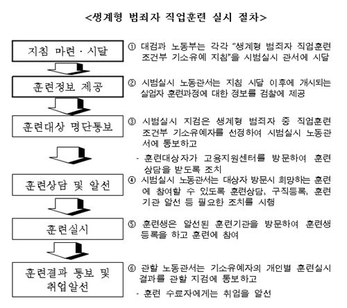 ‘직업훈련 조건부 기소유예’ 제도는 우선 이번 시범실시 지역 지검에서 ‘지역 내 생계형 범죄자 중 기소를 유예하고 직업훈련에 참여할 실업자’를 선별해 해당 지역 노동관서에 통보하면, 지역 노동관서가 당사자와의 상담을 거쳐 실업자 직업훈련 프로그램 중 적합한 훈련기관 등 알선해주고 훈련 수료 후 취업을 알선해주는 절차로 진행된다.