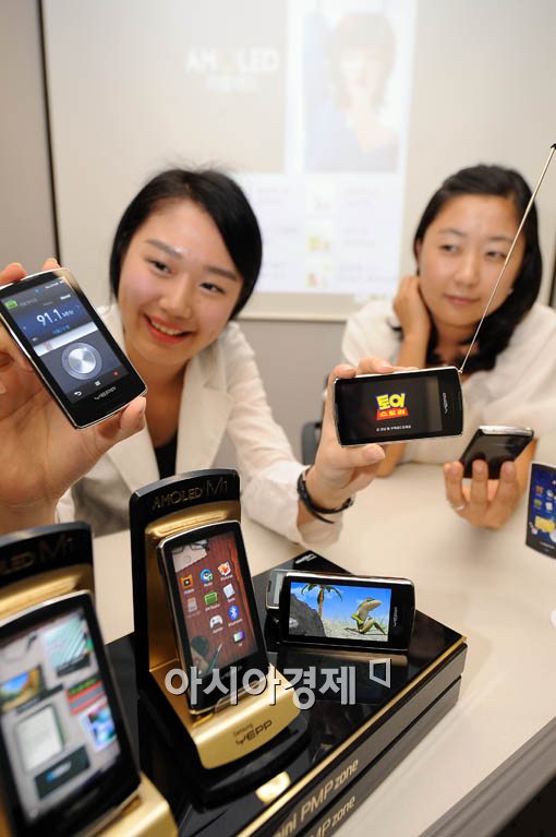 삼성전자는 23일 서울 서초 사옥에서 '꿈의 디스플레이' 아몰레드와 강력한 동영상 재생기능을 탑재한 터치스크린 MP3플레이어 '삼성 옙 아몰레드 M1(YP-M1)을 출시해 모델둘이 선보이고 있다.