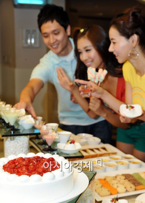 63 뷔페 파밀리온이 23일 오전 3단 초콜릿 퐁듀와 다양한 케이크, 생과일 등으로 화려하게 세팅된 디저트뷔페와 미술관을 함께 즐기는 달콤수다 패키지를 선보이고 있다. 이번에 선보인 '달콤수다 패키지' 는 평일 점심시간에 한해 디저트뷔페와 63스카이아트를 1만9000원에 즐길 수 있다.