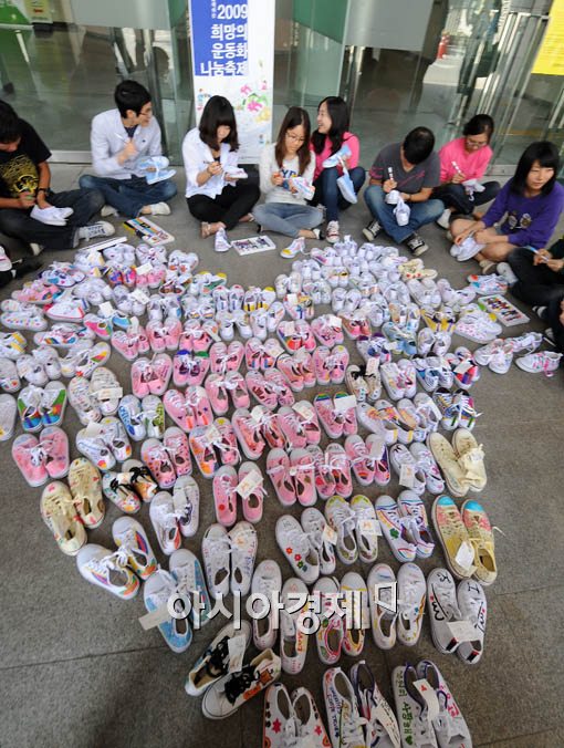 행사에 참석한 학생들이 1만2천여 켤레의 운동화에 세계평화를 상징하는 이미지를 그리고 있다.