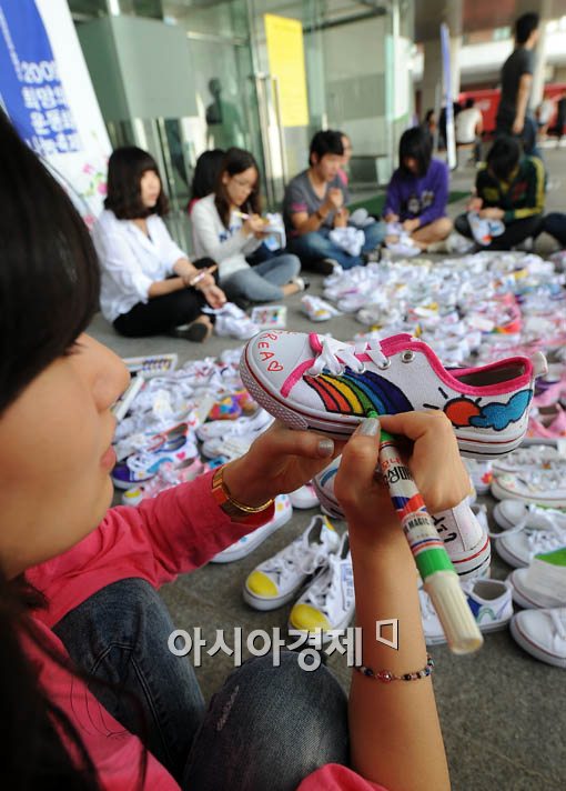 행사에 참석한 학생들이 1만2천여 켤레의 운동화에 세계평화를 상징하는 이미지를 그리고 있다.