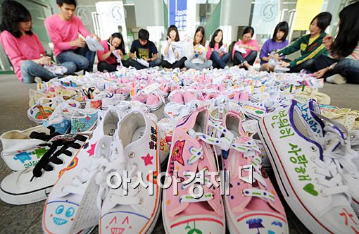 행사에 참석한 학생들이 1만2천여 켤레의 운동화에 세계평화를 상징하는 이미지를 그리고 있다.