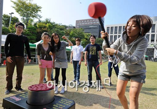 가을 축제가 한창인 23일 서울 명륜동 성균관대에 한 여학생이 스트레스 격파 게임기를 즐기고 있다.