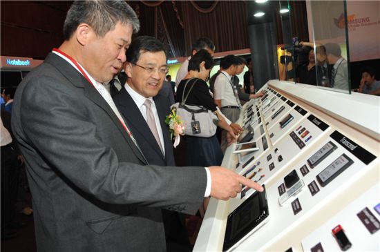 $pos="C";$title="";$txt="22일 대만 타이베이에서 개최된 제6회 삼성모바일솔루션 포럼에서 삼성전자 권오현 사장이 트랜센드(Transcend) 피터 슈(Peter Shu) CEO와 전시된 제품을 둘러보면 이야기를 나누고 있다.