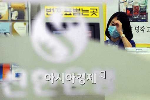 신한은행이 국내 은행권 최초로 신종플루 감염 직원이 속한 지점에 대해 휴무 조치가 내려진 25일 서울 신한은행 남부터미널금융센터 직원들이 마스크를 쓰고 업무를 보고 있다.