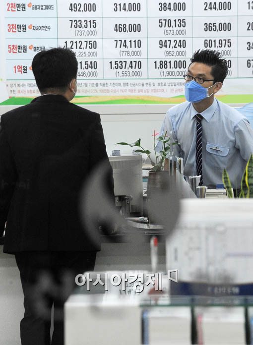 신한은행이 국내 은행권 최초로 신종플루 감염 직원이 속한 지점에 대해 휴무 조치가 내려진 25일 서울 신한은행 남부터미널금융센터 직원들이 마스크를 쓰고 업무를 보고 있다.