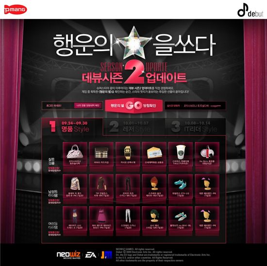 네오위즈게임즈는 '데뷰 시즌2' 서비스 개시를 기념해 '행운의 별을 쏘다' 이벤트도 진행할 예정이다. 이 이벤트는 오는 10월 14일까지 계속되며 명품가방, 화장품, 여행상품권, 디지털 카메라, 게임 아이템 등이 경품으로 제공된다.